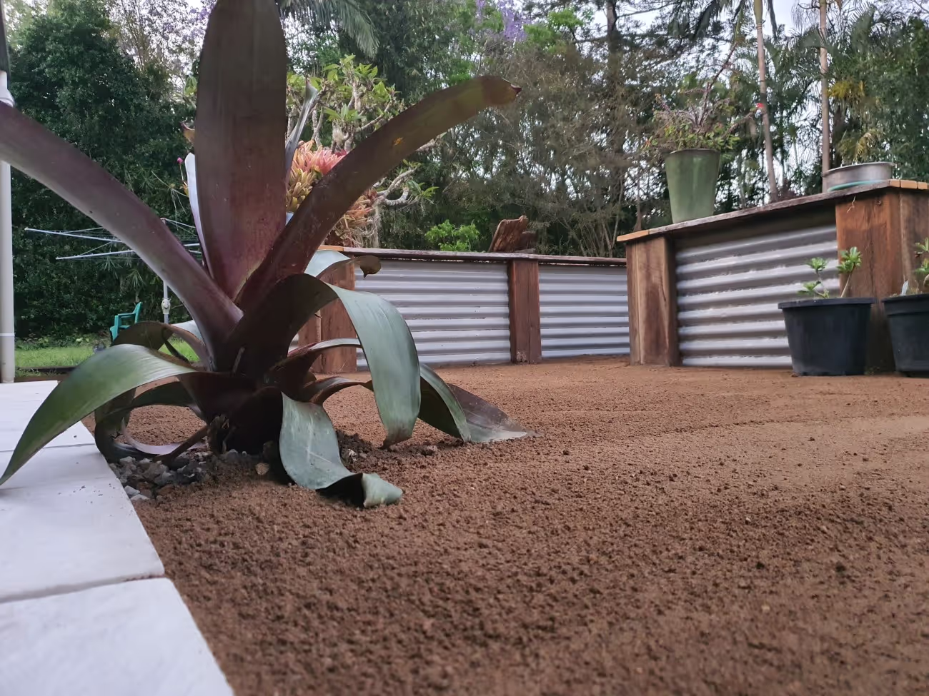 The surrounding area was then excavated and a paver edge concreted in place, we then add some road base and compacted the area to give a solid base underfoot. Decomposed granite is a good looking material and was used to cover the surface of the road base creating a natural finish to this project.