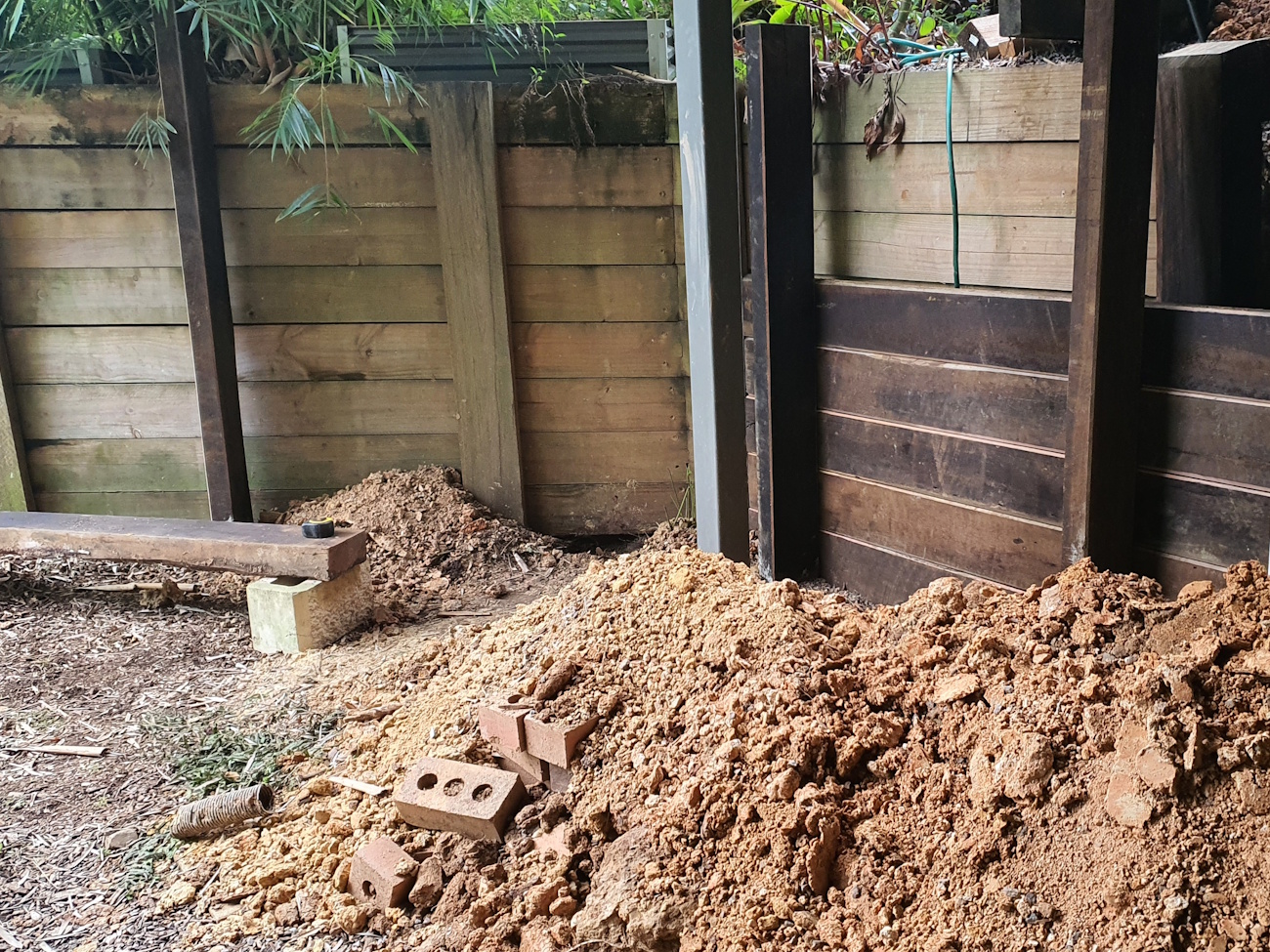 The retaining wall structures at Natalie's were in dire need of repair, apart from the obvious wall that had fallen down the remaining wall was on a lean outwards and needed support.